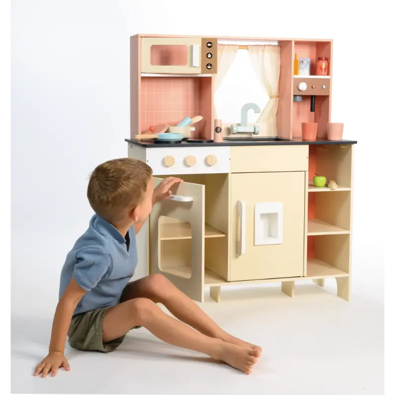 Made with sustainably sourced SVLK-certified rubber wood, this durable kitchen is crafted with care and designed to last. Its soft cream finish and neutral colours allow it to blend seamlessly into any playroom or family living space.